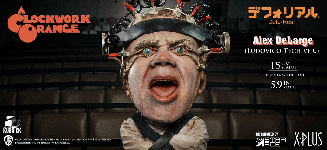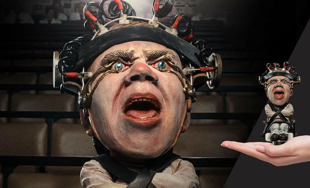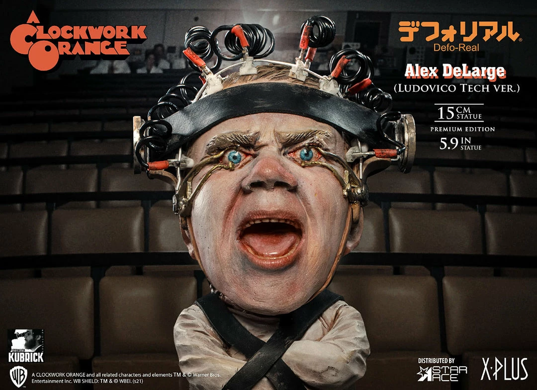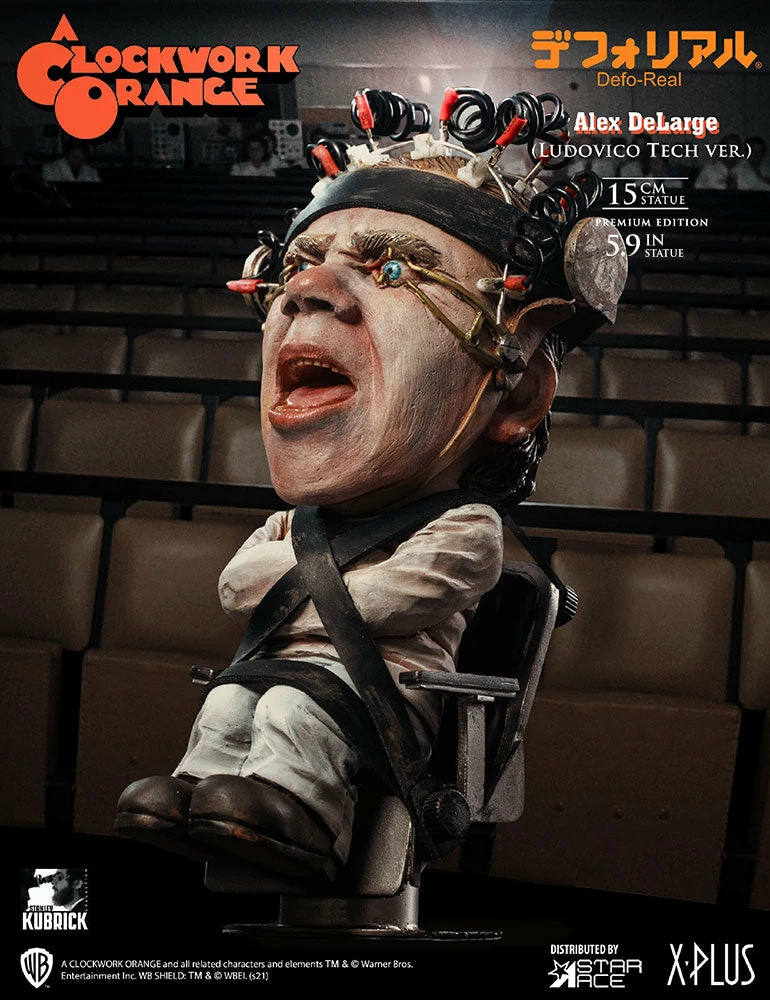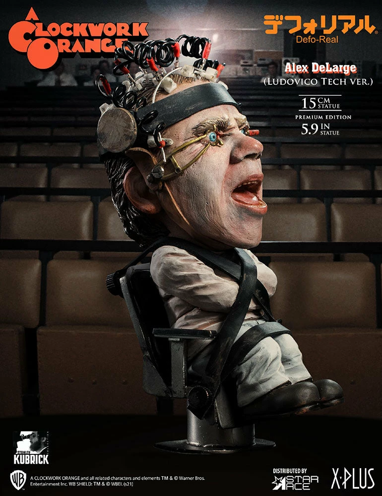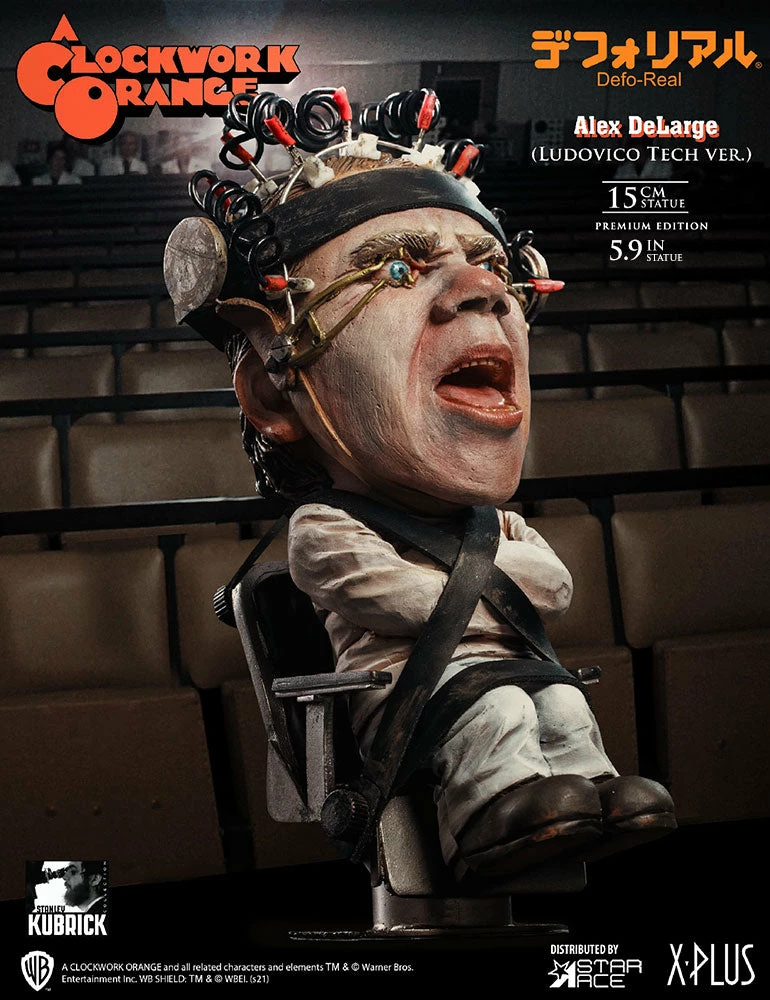 This statue features Alex undergoing the torturous “Ludovico Technique” to cure him of his violent tendencies. In this highly detailed sculpture, Alex is strapped to a chair with his eyelids pinned back, screaming in agony as his beautiful Ludwig Van plays while he’s forced to watch scenes of ultra-violence.