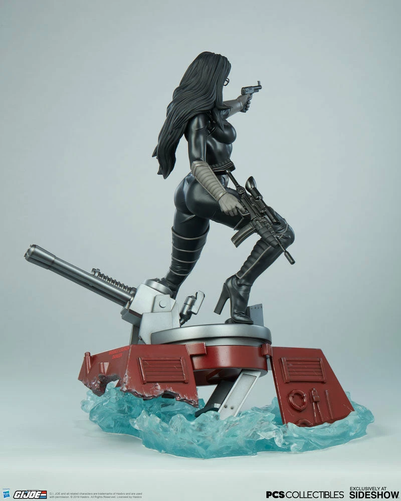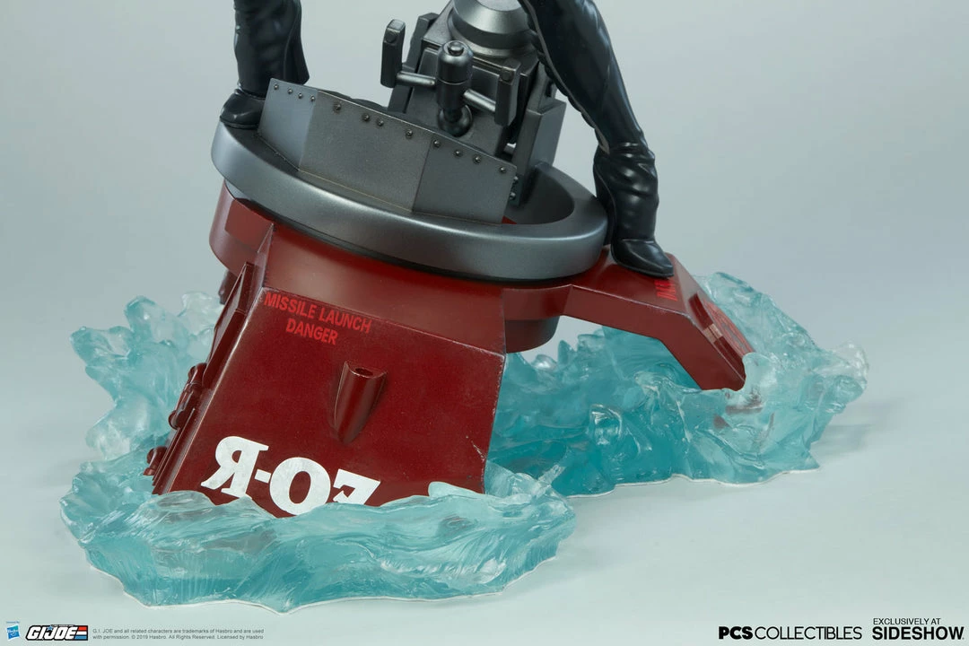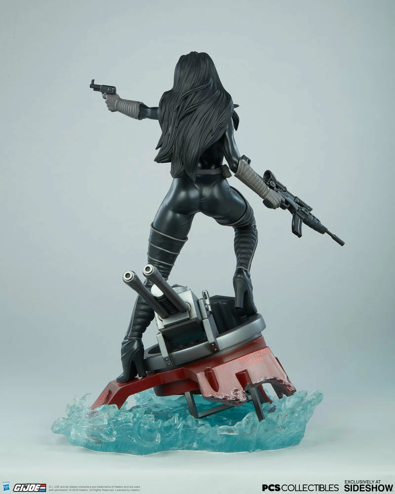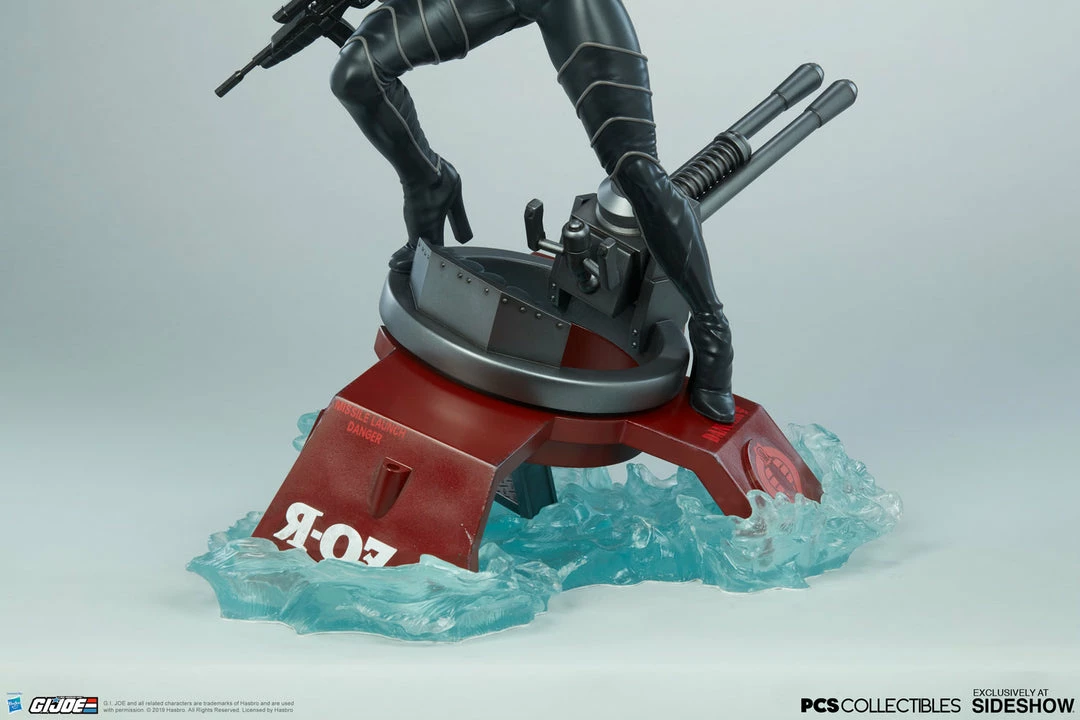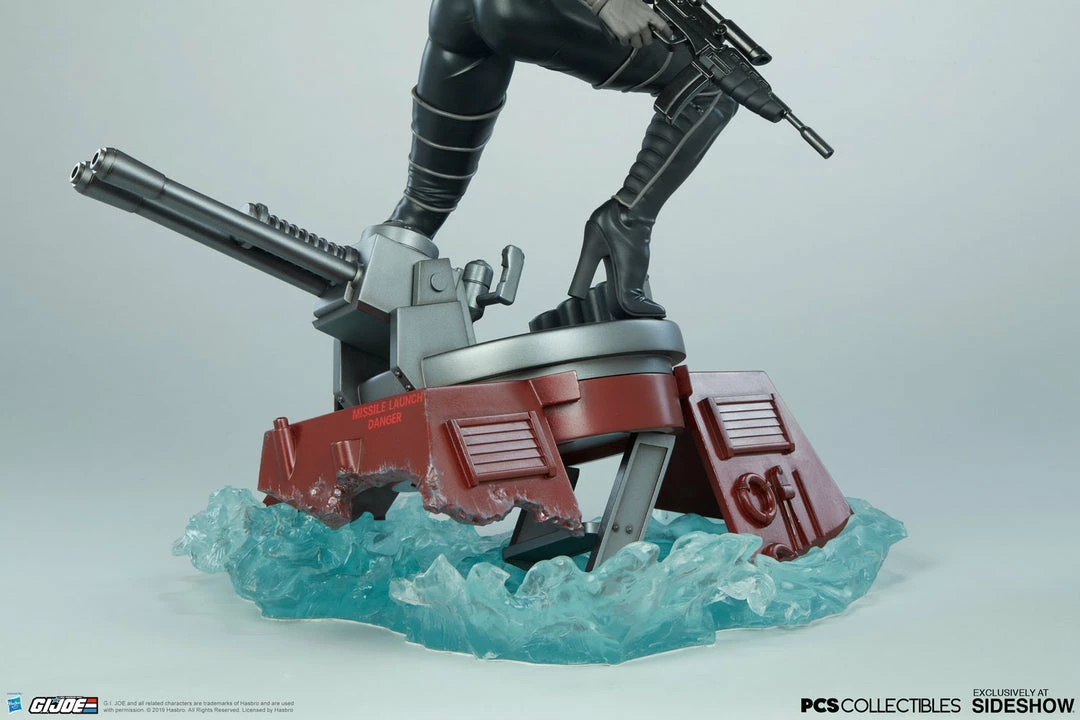 The Baroness Statue measures 22” tall as the ruthless lieutenant straddles the turret cannon of the Moray while it sinks beneath the water. Blue translucent waves churn against the red hydrofoil as Baroness stands her ground, waiting for extraction from the battle against G.I. Joe.
