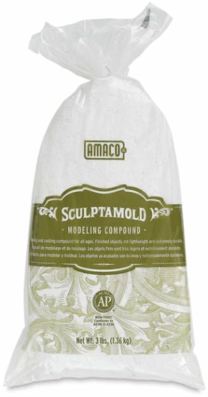 This white, non-toxic, cellulose-based compound combines the best features of clay, plaster, and papier mΓ’chΓ©. Sculptamold is lightweight like papier mΓ’chΓ©, but it does not shrink. It models and casts like clay, and sets up hard like plaster in about 30 minutes. Cast it in molds made of rubber, plastic, plaster, or even sand. It can be worked with tools, or by hand. While wet, it adheres to almost any clean surface, including glass. It can be applied to an armature, or over any core, without cracking or shrinkage. Apply wet material over dry to add finishing details. Cure the finished piece by allowing it to air dry for several days. The curing process can be speeded up in a low oven. Sculptamold dries exceptionally white, with a matte finish. Once it is dry, Sculptamold can be sawed, sanded, smoothed, carved, or nailed. Surfaces can be decorated with any paint. Sculptamold is not waterproof, but a finished piece can be made water resistant with clear lacquer, varnish, or gloss acrylic. Finished pieces are lightweight, but also strong and durable. Sculptamold pieces are shatter and break resistant. Sculptamold is furnished as a dry powder, and can be prepared easily within minutes by adding water. To prepare, blend approximately two parts Sculptamold with one part water. Mix only an amount that can be used in less than 30 minutes, and clean the mixing container before preparing a new batch, because hardened material acts as a catalyst, speeding the hardening of a new batch. Use a slightly thinner mix for molding and finishing.