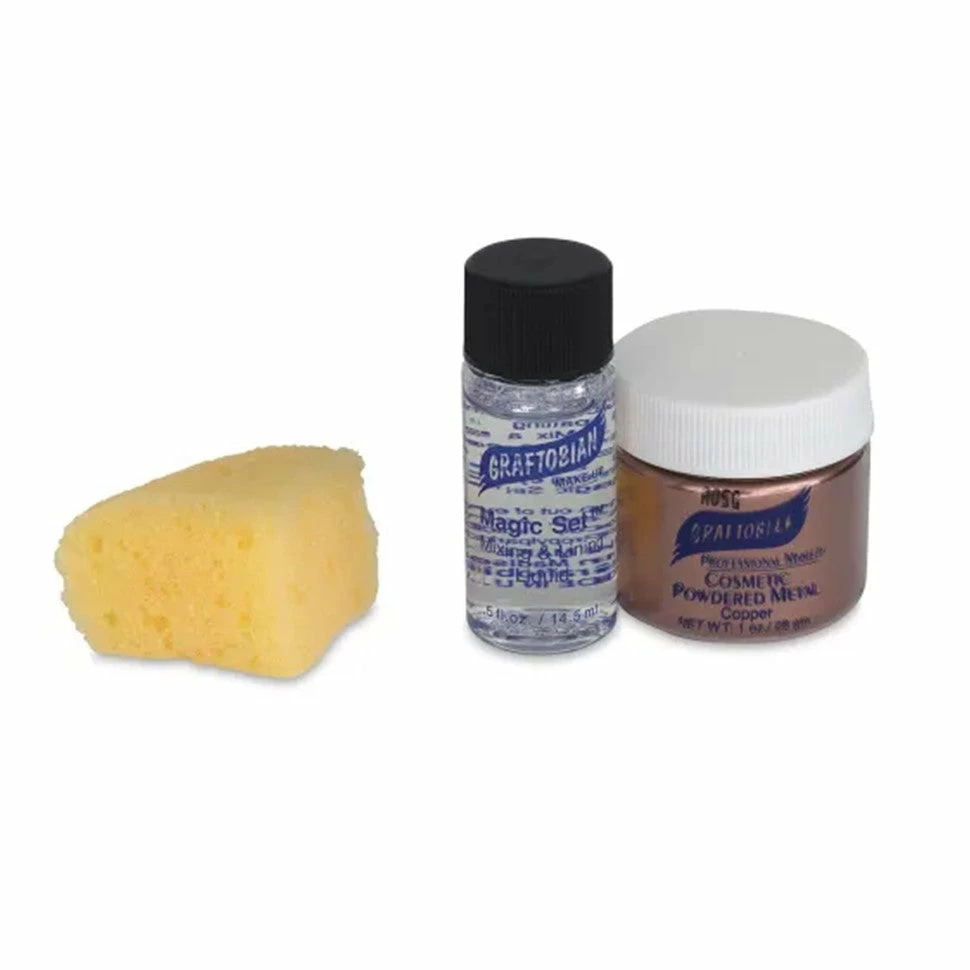 Create dramatic metallic effects with Graftobian Metal Mania Cosmetic Powdered Metal Kits. This popular metallic makeup is safe, easy to apply, and yields stunning results. Kits include a jar of Cosmetic Powdered Metal, a 0.5 oz bottle of Magic Set Mixing and Lining Liquid, and an applicator sponge. Mix the ultra-fine cosmetic powder with the Magic Set liquid, then paint or sponge the formula onto skin. Once dry, the metallic makeup is totally opaque and durable — it won’t rub off. Wash it from skin with soap and water. Made in the USA. Note — May stain some fabrics. Test on an inconspicuous area before use.