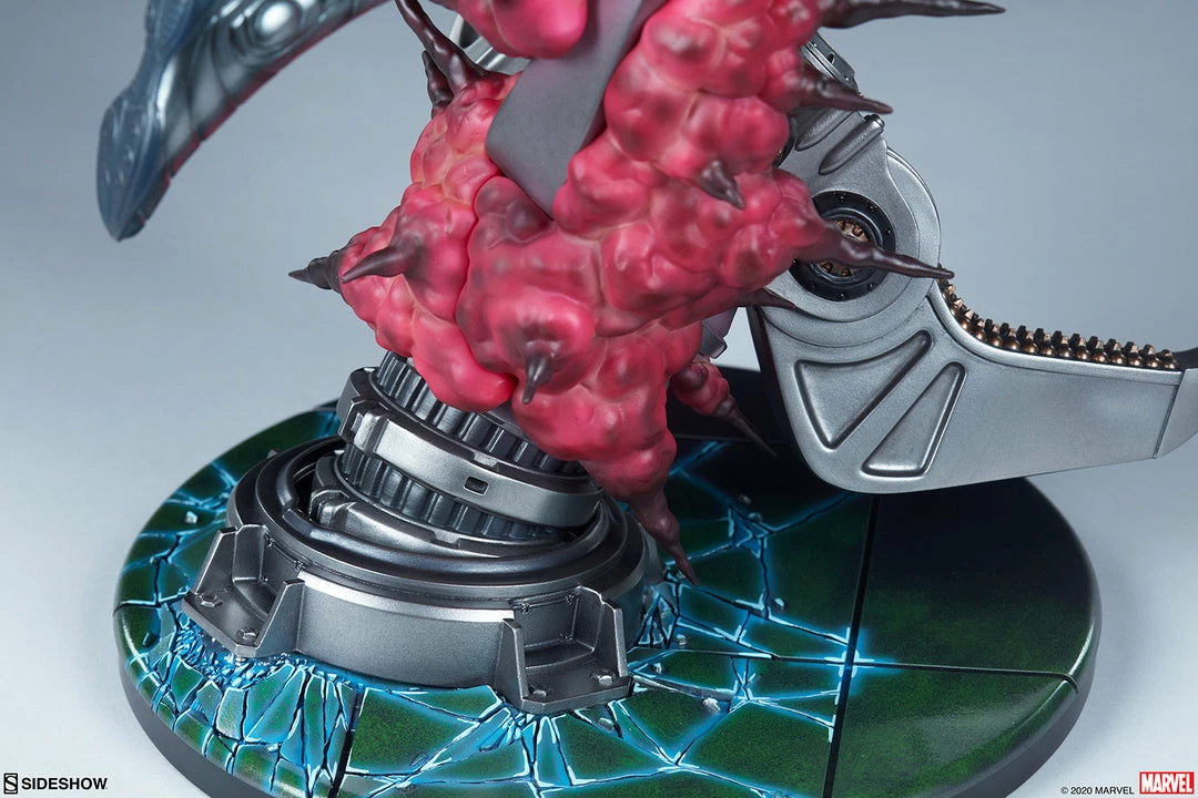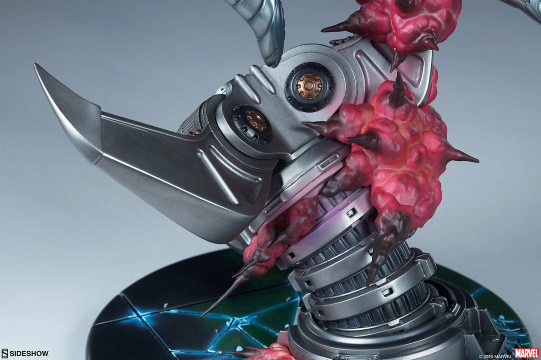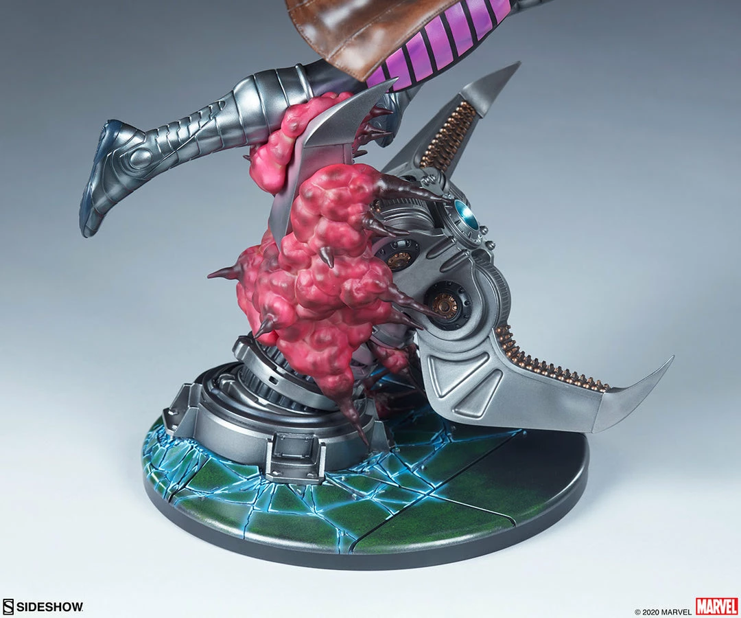 The Gambit Maquette measures 21β tall as the raginβ Cajun charges into battle over a giant mechanical claw emerging from the Danger Room base. Purple bursts of kinetic energy explode out of the weapon as Remy LeBeau leaps to the aid of his fellow X-Men, clutching his bo staff and flinging several charged-up playing cards into the fray.
