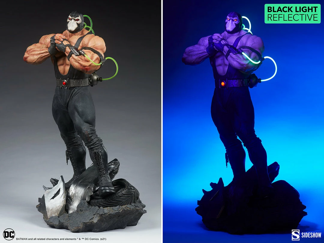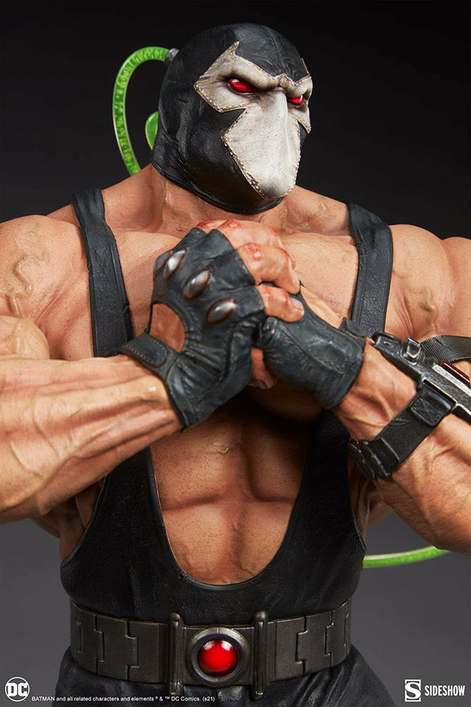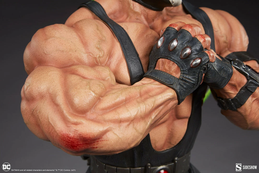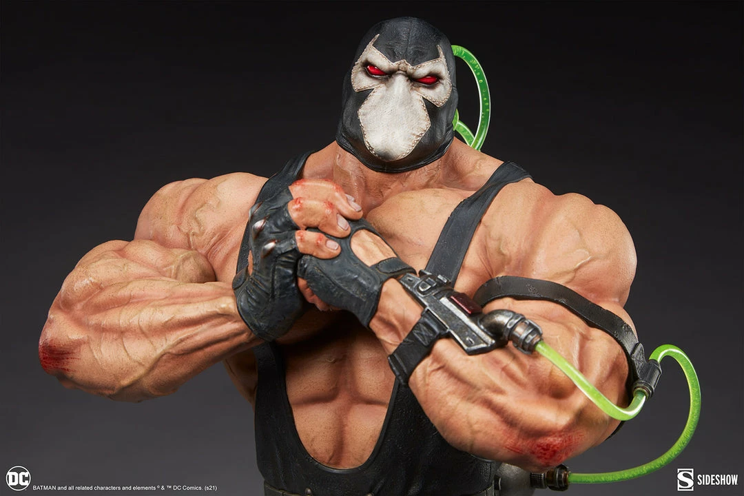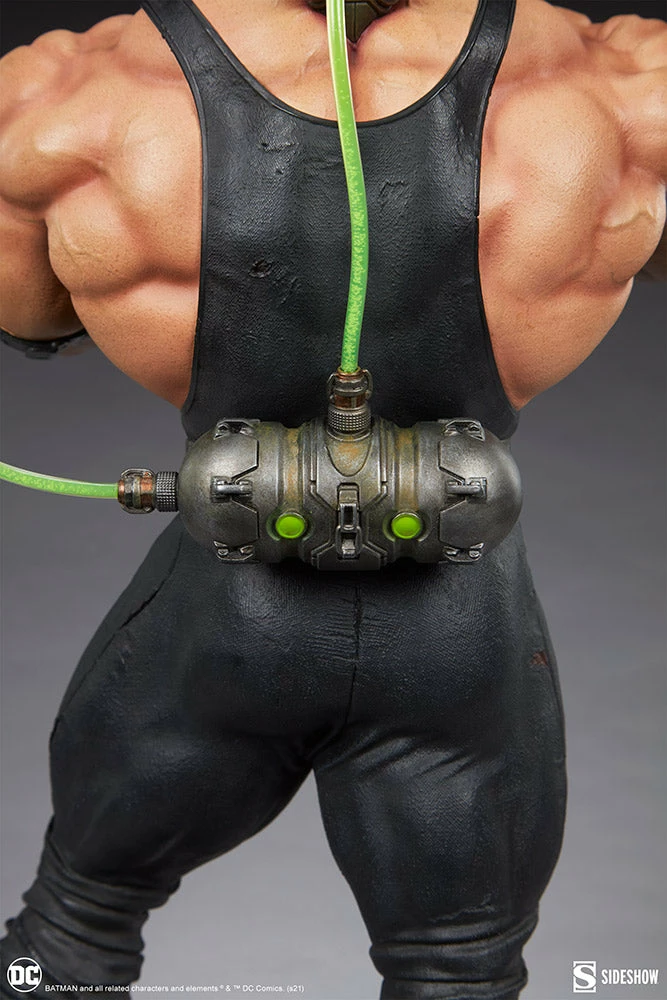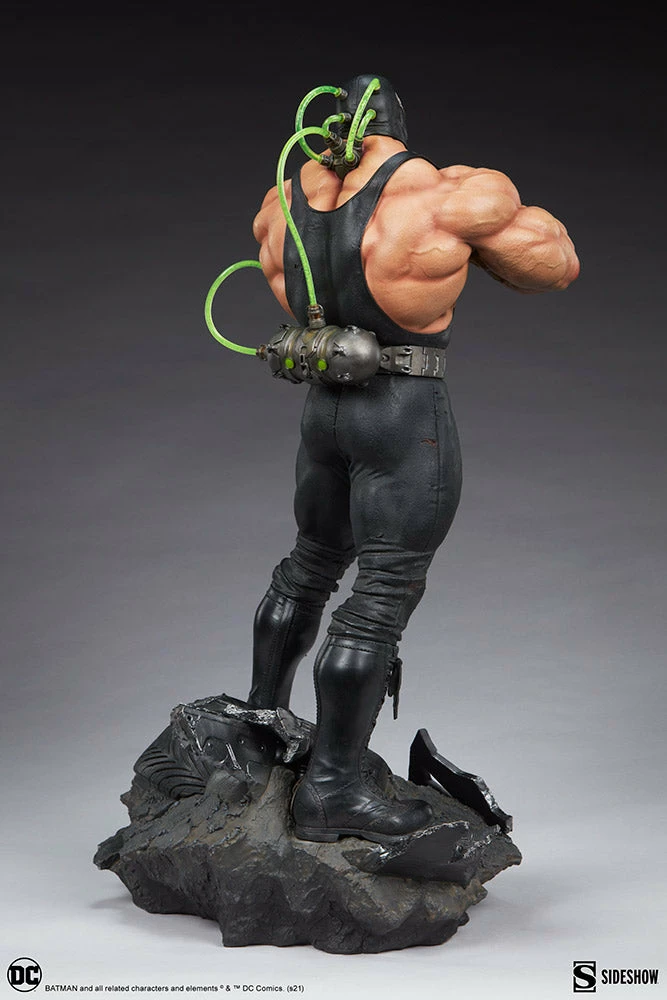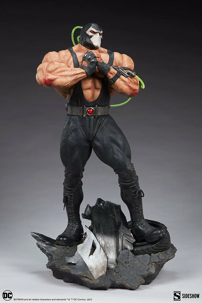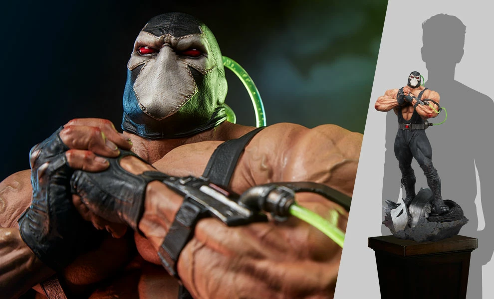 The Bane Maquette measures 26โ tall standing on the debris of a damaged Batmobile, with one wheel removed and its front bumper peeled apart. Eager for a real challenge, the ruthless King of Peรฑa Duro cracks his bloodied knuckles in anticipation of a battle against Batman while fueled by the Venom drug in his veins.