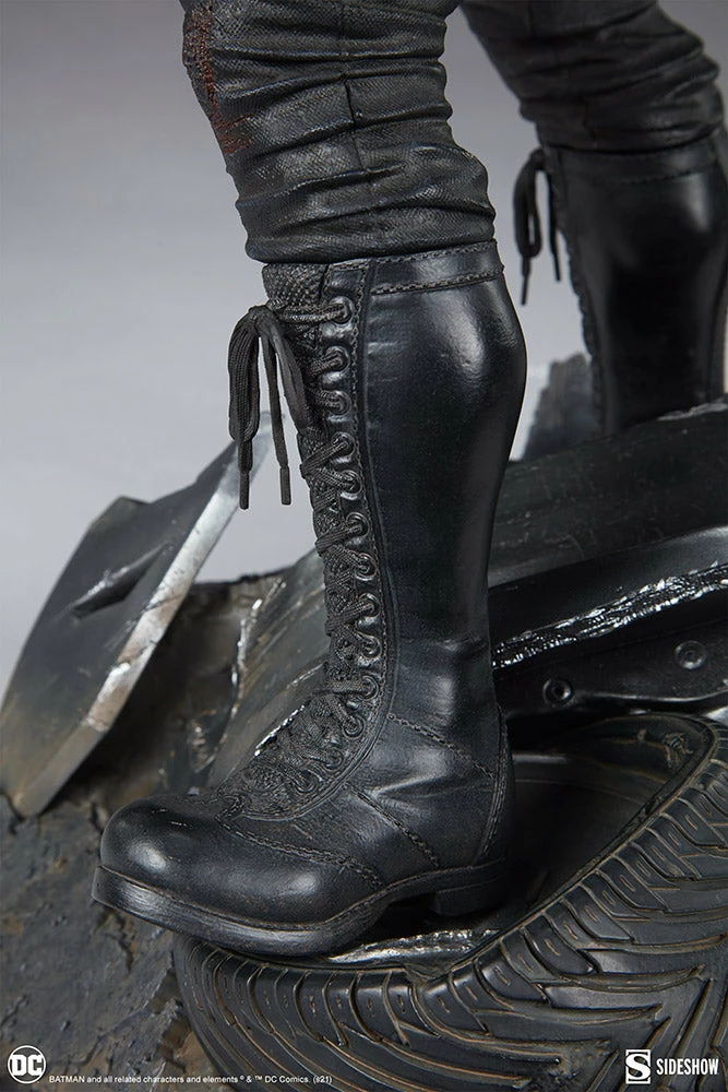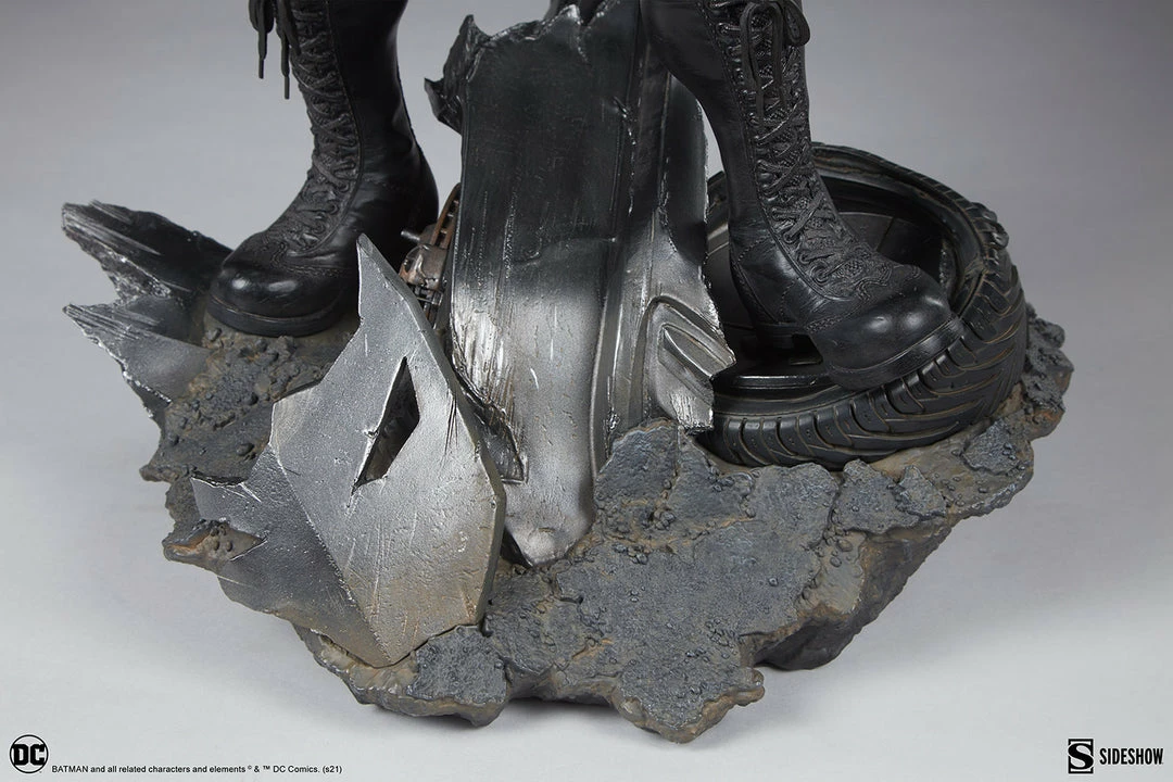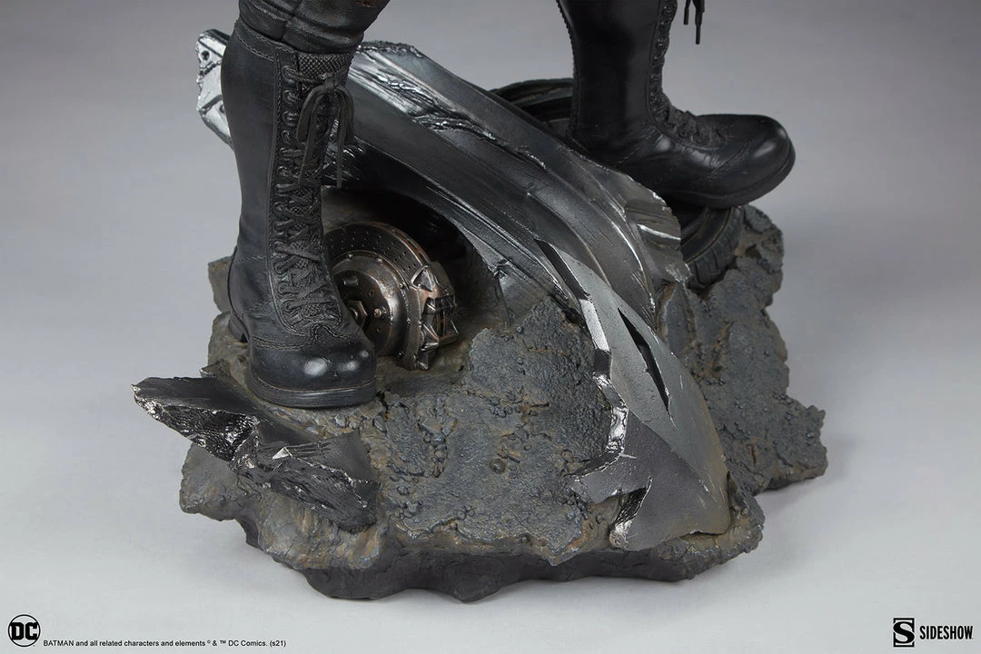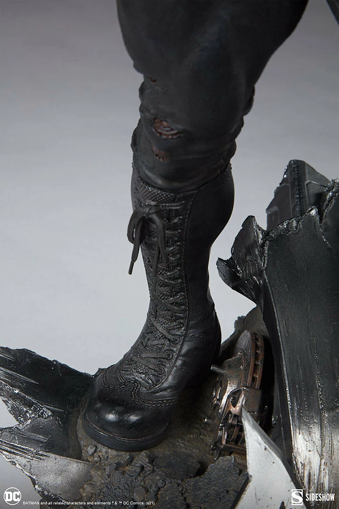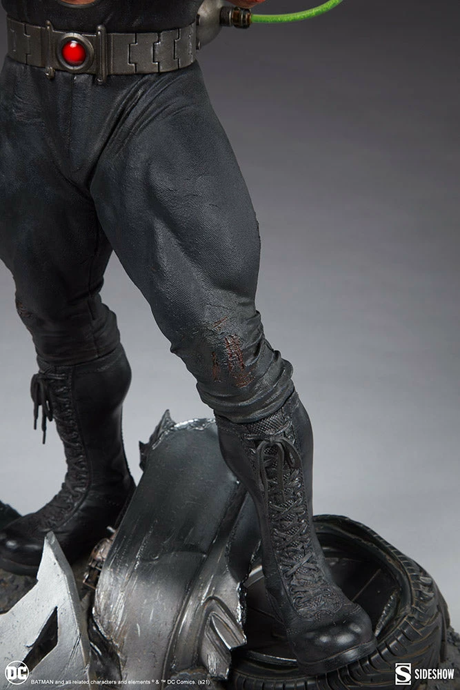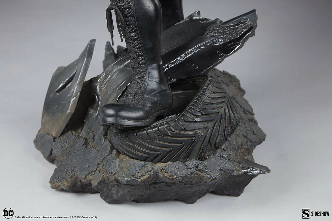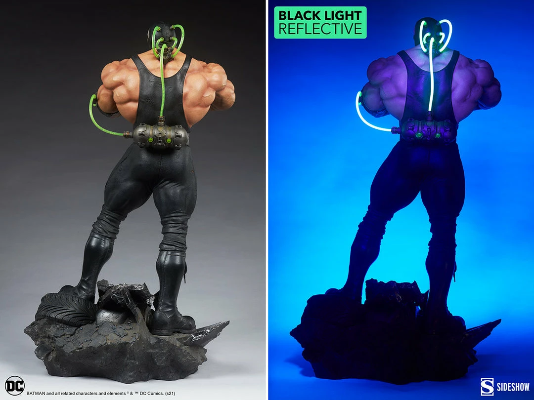 The Bane Maquette measures 26โ tall standing on the debris of a damaged Batmobile, with one wheel removed and its front bumper peeled apart. Eager for a real challenge, the ruthless King of Peรฑa Duro cracks his bloodied knuckles in anticipation of a battle against Batman while fueled by the Venom drug in his veins.