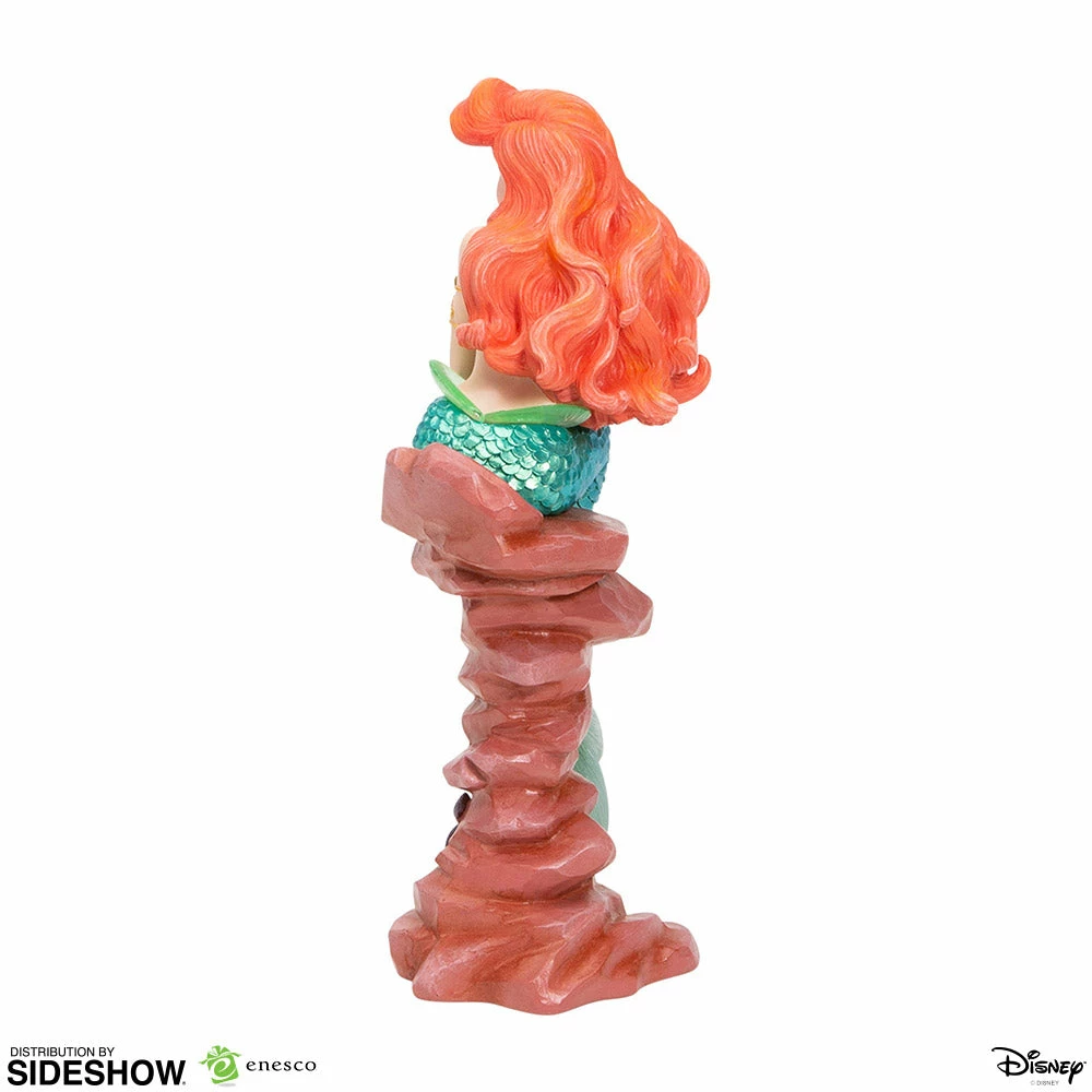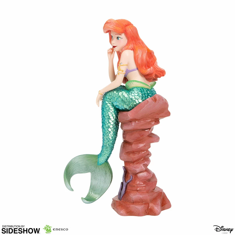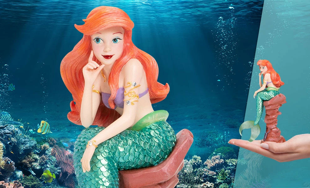 The most iconic mermaid in the world, free-spirited and curious Ariel from Disneyโs The Little Mermaid poses on an undersea rock formation evoking a stylish contemporary glamour in this sophisticated figurine from Disney Couture de Force. The modern haute couture costuming features duo-chrome color shift blue green scales on Arielโs tail, four faceted faux diamonds on her golden arm bracelets and pendant and an iridescent sea foam green finish on her fin. Other exquisite details include translucent tinted green elements around her waist and textured red hair sculpted so as to appear floating underwater. Princess Arielโs timeless and magical story from the undersea to the human world empowers us to seek our dreams and dare to be adventurous in our everyday lives.