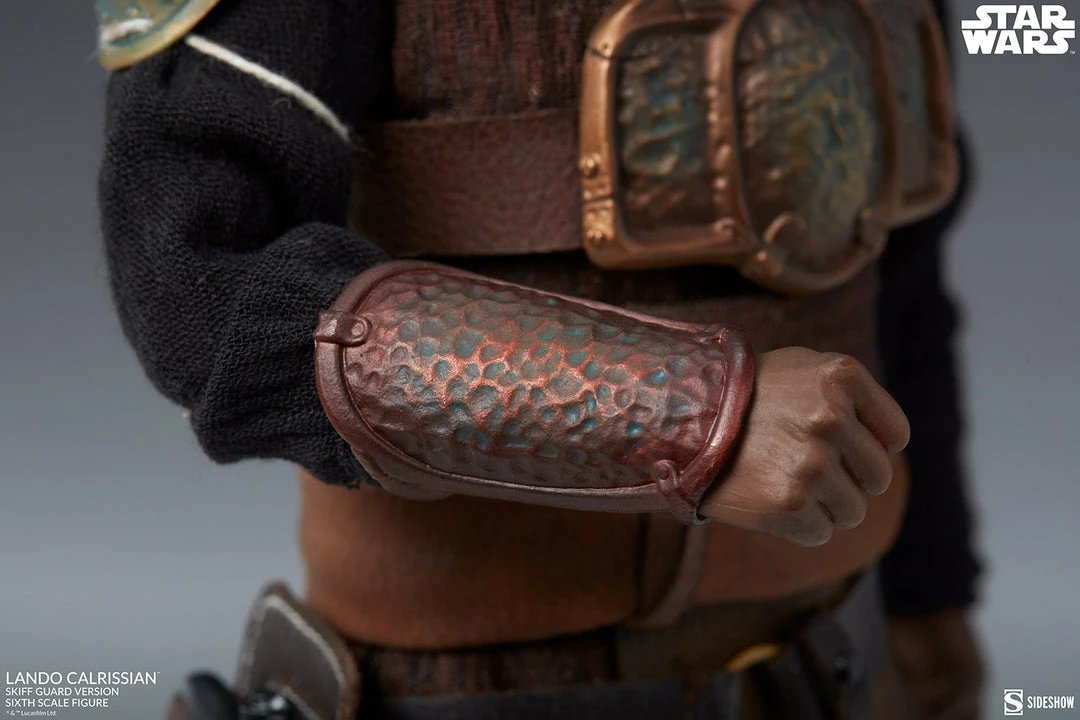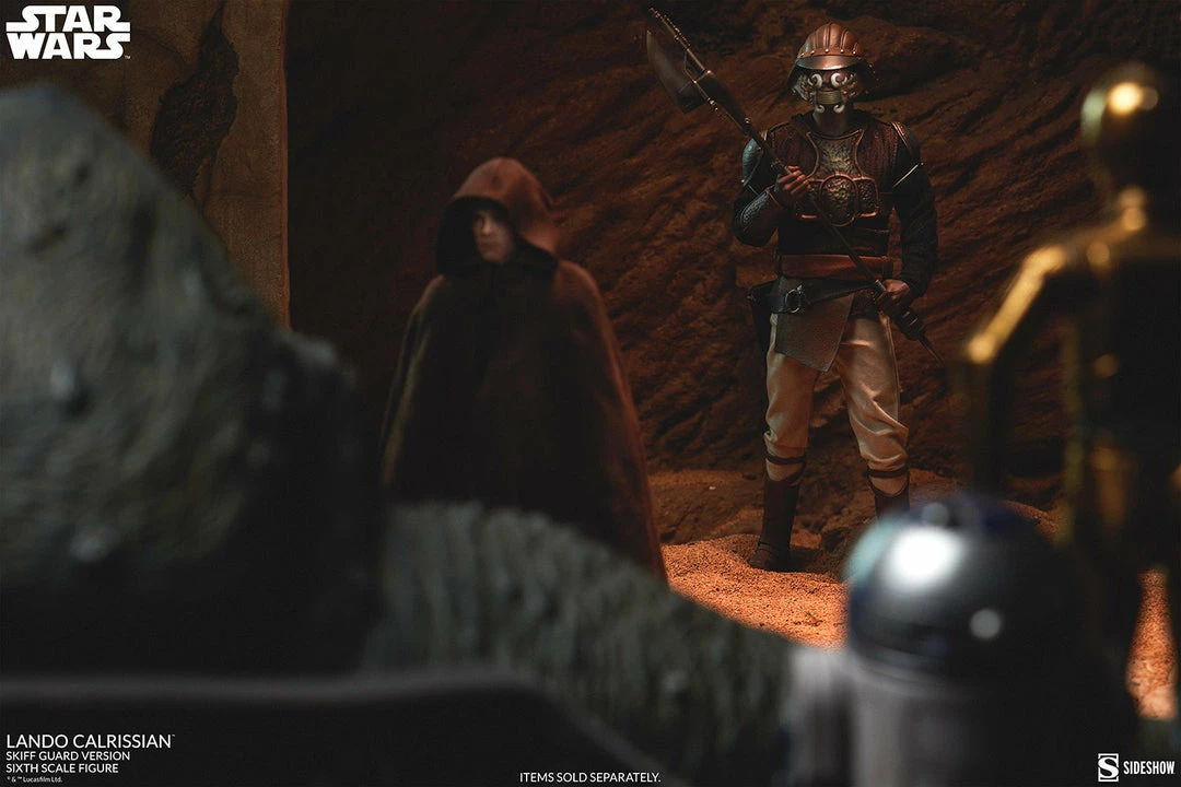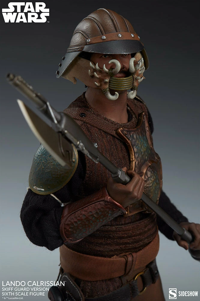 The Lando Calrissian Skiff Guard Version Sixth ScaleΒ Star Wars FigureΒ captures the Bespin baronβs distinct disguised look fromΒ Star Wars: Episode VI- Return of the Jedi, as he accompanies the infiltration mission to Jabba the Huttβs palace on Tatooine. The figure includes both an unhelmeted portrait with the detailed likeness of actor Billy Dee Williams and an alternate portrait with a non-removable helmet and mask as a part of his full guard uniform.