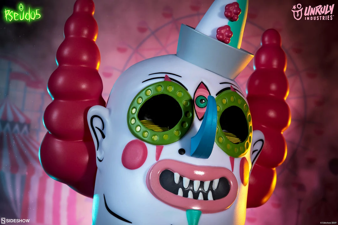 Pseudo5 is a psychedelic dark artist who specializes in creating neon illustrations of cryptozoological creatures and creepy clowns among other wild monstrosities! Part of what makes her work so exciting is her youthful sense of wonder and fantasy that makes its way into each piece. Her work walks a fine line between repulsion and enticement, and bright colors and playful style with dark imagery are trademarks of her work.