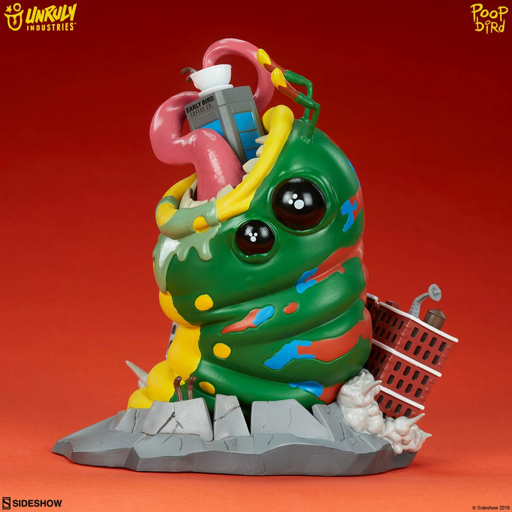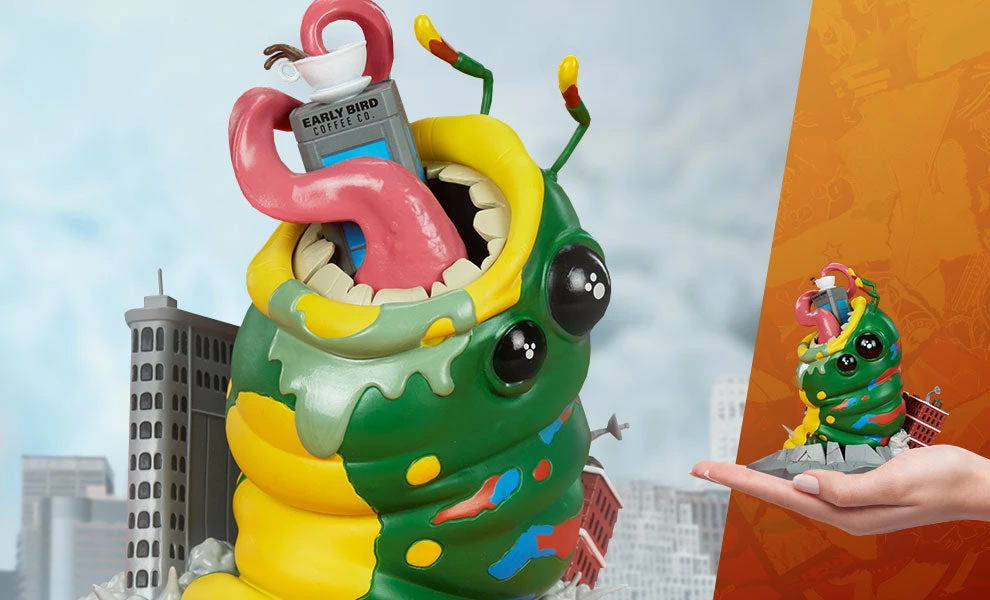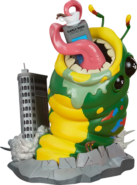You’d have to get up pretty early to outsmart the Wrath of Wormzilla! designer toy by Mike “Poopbird” Groves. While this lovable kaiju lays waste to the city, he’ll worm his way right into your heart!